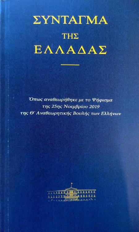 Η Διεύθυνση Εκδόσεων και Εκτυπώσεων της Βουλής των Ελλήνων θέτει, σήμερα, σε διανομή το κείμενο του Συντάγματος, όπως αναθεωρήθηκε. Η έκδοση περιλαμβάνει πρόλογο του Προέδρου της Βουλής, κ. Κωνσταντίνου Αν. Τασούλα, και ευρετήριο όρων σημαντικά εμπλουτισμένο σε σχέση με αυτό της προηγούμενης έκδοσης του Συντάγματος.