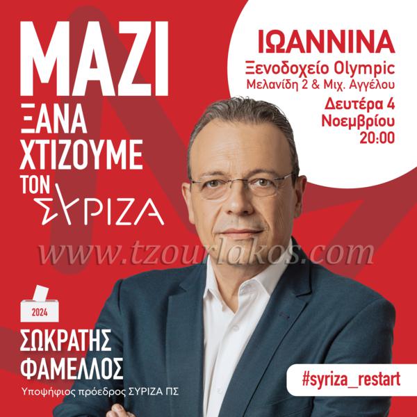 Πρόγραμμα επίσκεψης του υποψηφίου προέδρου του ΣΥΡΙΖΑ-ΠΣ, Σωκράτη Φάμελλου, στα Ιωάννινα | Δευτέρα 4 Νοεμβρίου