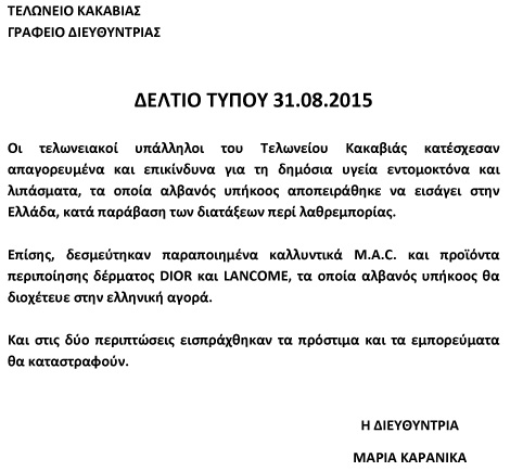 Μπλόκο από το Τελωνείο Κακαβιάς σε παράνομα προϊόντα