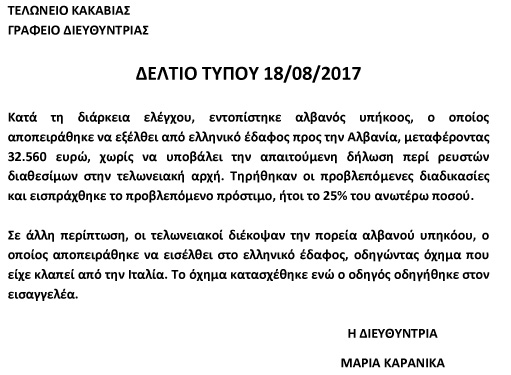 Τελωνείο Κακαβιάς. STOP σε δύο αλβανούς