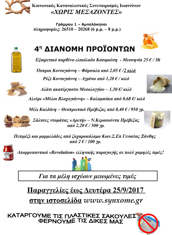 O Κοινωνικός Καταναλωτικός Συνεταιρισμός Ιωαννίνων "Χωρίς Μεσάζοντες" είναι έτοιμος για την 4η διανομή προϊόντων και συνεχίζει δυναμικά τη λειτουργία του μετά την παύση του Αυγούστου.