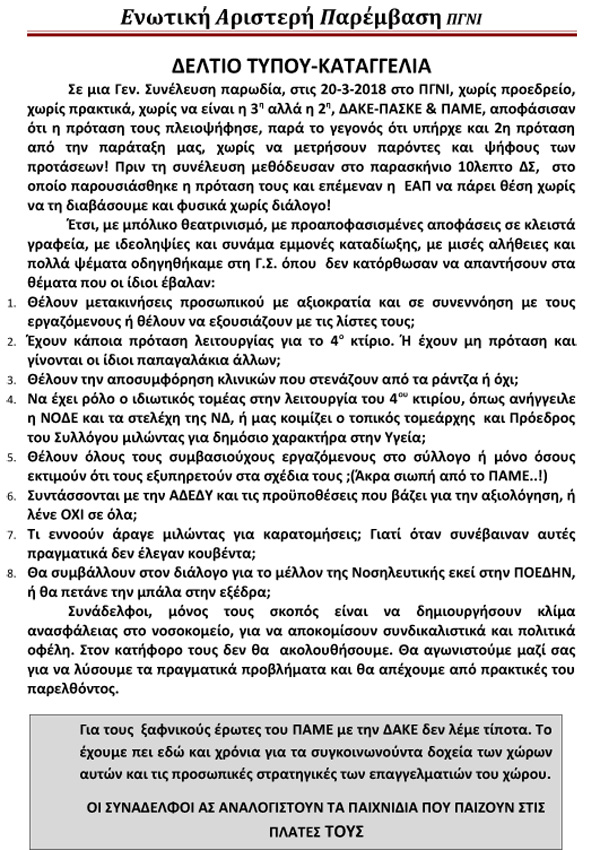 Ενωτική Αριστερή Παρέμβαση.Καταγγελία για την Γ. Συνέλευση στις 20-3-2018