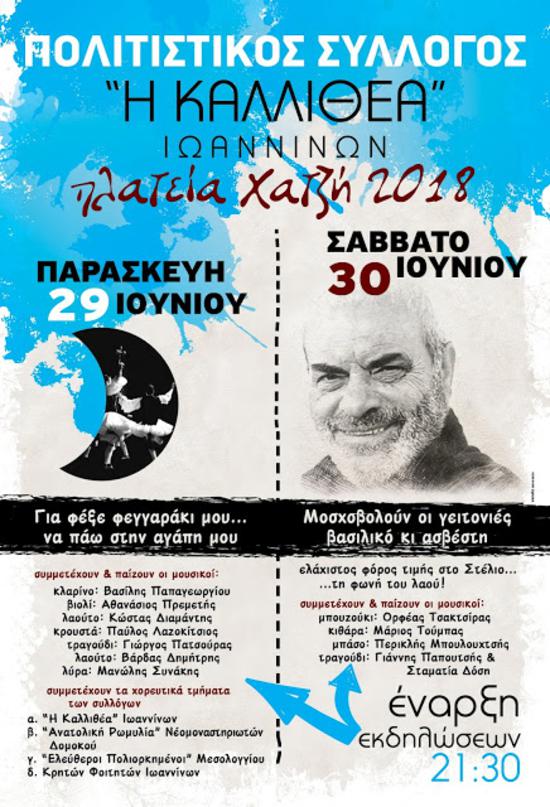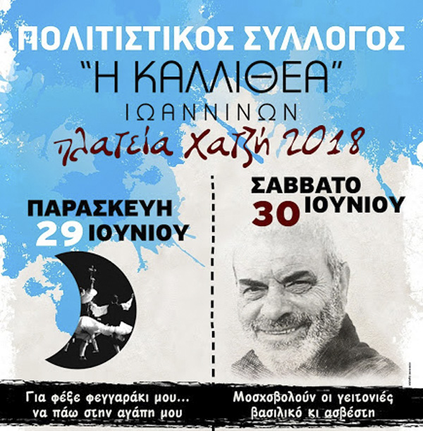 Ο πολιτιστικός Σύλλογος «η Καλλιθέα» Ιωαννίνων όπως κάθε χρόνο διοργανώνει διήμερο πολιτιστικών εκδηλώσεων την Παρασκευή 29 και το Σάββατο 30 Ιουνίου στην Πλατεία Χατζή!