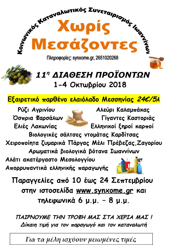 Ιωάννινα: Κοινωνικός Καταναλωτικός Συνεταιρισμός.Διάθεση προϊόντων από 1 έως 4- Οκτωβρίου.