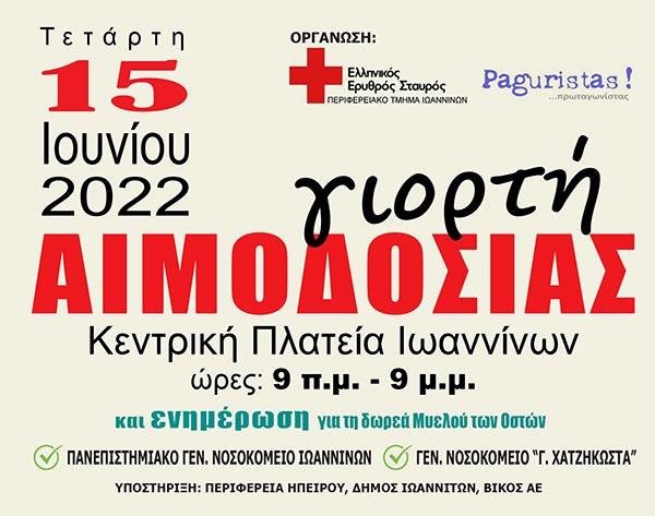 Τη δική του «γιορτή αιμοδοσίας» διοργανώνει το Τμήμα Ιωαννίνων του Ελληνικού Ερυθρού Σταυρού, σε συνεργασία με την Εθελοντική Ομάδα των Paguristas την Τετάρτη, 15 Ιουνίου, με ανοικτή αιμοδοσία από τις 9 το πρωί μέχρι 9 το βράδυ στην Κεντρική Πλατεία Ιωαννίνων. Η «γιορτή» γίνεται με αφορμή την Παγκόσμια Ημέρα του Εθελοντή Αιμοδότη, που είναι η 14η Ιουνίου.