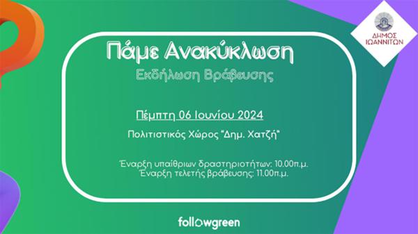 του προγράμματος Followgreen θα βραβεύσει ο Δήμος Ιωαννιτών μεθαύριο, Πέμπτη και ώρα 11 π.μ. στον Πολιτιστικό Πολυχώρο «Δημ. Χατζής».