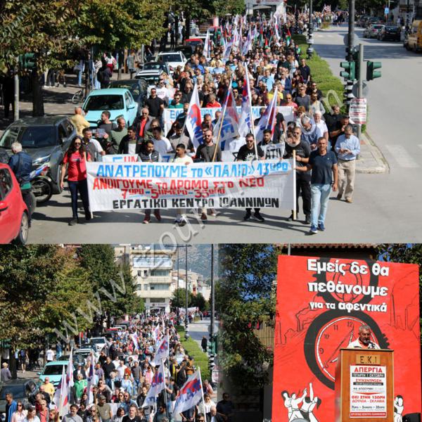 Μεγάλοι χώροι δουλειάς ολόκληρα εργοστάσια, νέκρωσαν στα Γιάννενα: Το «ΖΑΓΟΡΙ», η φαρμακοβιομηχανία «HELP», η γαλακτοβιομηχανία «ΔΩΔΩΝΗ» κ.α. Εκατοντάδες βιομηχανικοί εργάτες που ξέρουν τι σημαίνει εξάντληση και ατελείωτα ωράρια, έδωσαν σήμερα τη δική τους απάντηση: «Στα σκουπίδια» το νομοσχέδιο της κυβέρνησης για το 13ωρο. Η σημερινή απεργία έδειξε στην πράξη τι σημαίνει οργανωμένη δύναμη των εργατών: Να μένουν νεκρά εργοστάσια, να σμίγουν στο ίδιο βήμα εργάτες, αγρότες, φοιτητές και συνταξιούχοι, να δίνεται το μήνυμα ότι το νομοσχέδιο αυτό δεν θα εφαρμοστεί στη ζωή, όσο κι αν κυβέρνηση και εργοδοσία το επιδιώκει.