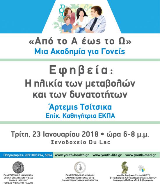 Το Παιδαγωγικό Τμήμα Νηπιαγωγών, ο Τομέας Υγείας του Παιδιού του Τμήματος Ιατρικής του Πανεπιστημίου Ιωαννίνων και η Μονάδα Εφηβικής Υγείας της Β’ Παιδιατρικής Κλινικής του Πανεπιστημίου Αθηνών διοργανώνουν στα Ιωάννινα διαδραστικές συναντήσεις με τίτλο «Από το Α ως το Ω - μια Ακαδημία για Γονείς».