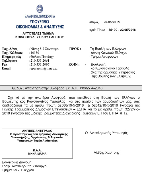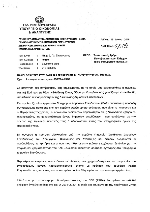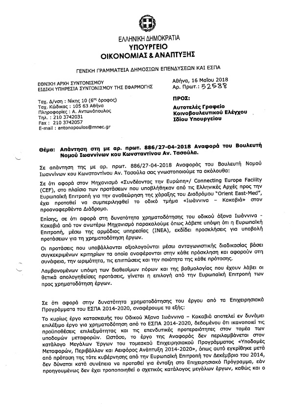 Σήμερα, 7 ολόκληρους μήνες μετά, το αρμόδιο Υπουργείο Οικονομίας και Ανάπτυξης απαντώντας σε Αναφορά μου, με την οποία διεβίβασα τεκμηριωμένο σχετικό αίτημα του Δημάρχου Ζίτσας προς την Κυβέρνηση μας ενημερώνει ότι το σημαντικό αυτό έργο περιλαμβάνεται απλώς σε πρόταση των Ελληνικών Αρχών προς την Ευρωπαϊκή Επιτροπή για την αναθεώρηση της χάραξης του Πανευρωπαϊκού Διαδρόμου «ORIENT EAST-MED» που ξεκινά από την Γερμανία και καταλήγει στην Ελλάδα και εντάσσεται στον Μηχανισμό (Χρηματοδοτική Διευκόλυνση) «Συνδέοντας την Ευρώπη» ( «Connecting Europe Facility (CEF)» ).