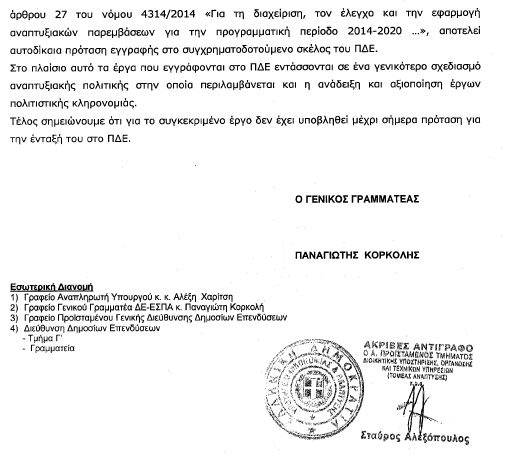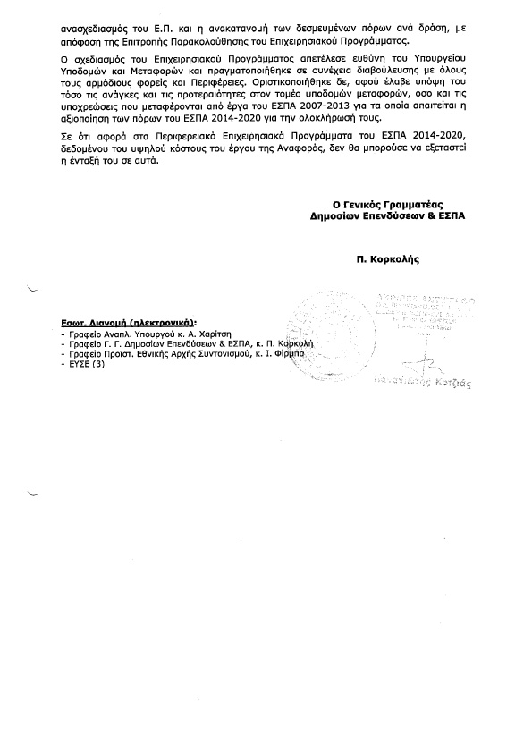 Στην ίδια απάντηση η Κυβέρνηση μας πληροφορεί ότι το έργο αυτό που κατά τον κ.Τσίπρα έχει μπεί σε τροχιά υλοποίησης, δεν μπορεί να χρηματοδοτηθεί ούτε από το ΕΣΠΑ 2014-2020, ούτε από τις Δημόσιες Επενδύσεις αλλά και ούτε από το Επιχειρησιακό Πρόγραμμα «Υποδομές Μεταφορών, Περιβάλλον και Αειφόρος Ανάπτυξη 2014-2020».