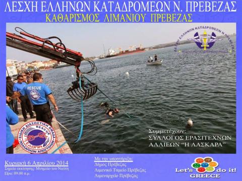 Η ΛΕΣΧΗ ΕΛΛΗΝΩΝ ΚΑΤΑΔΡΟΜΕΩΝ Ν. ΠΡΕΒΕΖΑΣ και ο Σύλλογος Ερασιτεχνών Αλιέων " Η ΛΑΣΚΑΡΑ " Πρέβεζας συμμετέχοντας στην Πανελλήνια εθελοντική εκστρατεία "Let's do it Greece-Καθαρίζουμε την Ελλάδα σε μία μέρα" προχωρούν στον καθιερωμένο πλέον Καθαρισμό του Λιμανιού Πρέβεζας την Κυριακή 6 Απριλίου 2014.