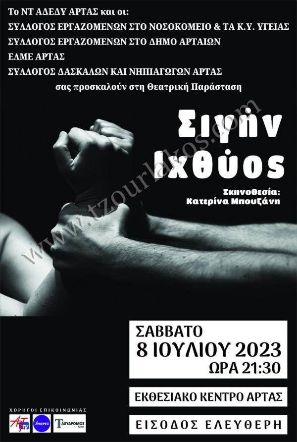 Η παράσταση είναι του θεατρικού εργαστηρίου ΚΛΕΨύΔΡΑ και θα παρουσιαστεί στο Εκθεσιακό Κέντρο Άρτας, το Σάββατο 8 Ιούλιου 2023, στις 9:30 το βράδυ.