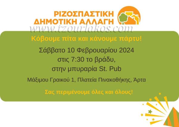Άρτα: Ριζοσπαστική Δημοτική Αλλαγή. Κοπή πίτας το Σάββατο... Άρτα: Ριζοσπαστική Δημοτική Αλλαγή. Κοπή πίτας το Σάββατο 10 Φεβρουαρίου 2024. Θέλεις πραγματικά να γνωρίσεις την Ήπειρο;;Επισκέψου και κάνε εγγραφή στο κανάλι μας TZOURLAKOS στο youtube και διάλεξε ένα από τα 1300 βίντεο μέχρι στιγμής και συνεχίζουμε!... Tweet Προηγούμενο Επόμενο