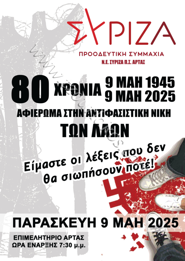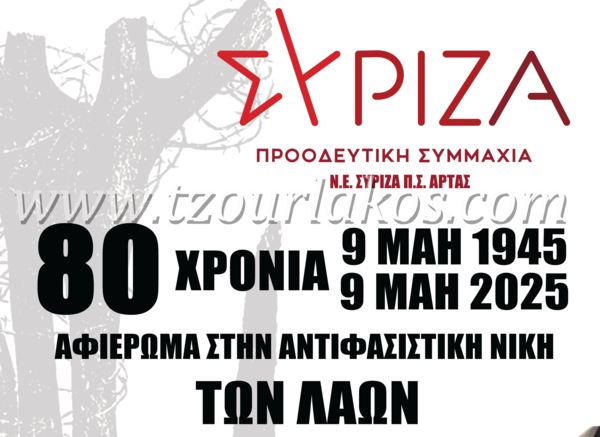 Ο ΣΥΡΙΖΑ – Προοδευτική Συμμαχία Άρτας τιμά την 9η Μαΐου, Ημέρα της Αντιφασιστικής Νίκης των Λαών, με εκδήλωση που θα πραγματοποιηθεί την Παρασκευή 9 Μαΐου 2025, στις 19:30, στην αίθουσα του συνεδριακού κέντρου του Επιμελητηρίου Άρτας.
