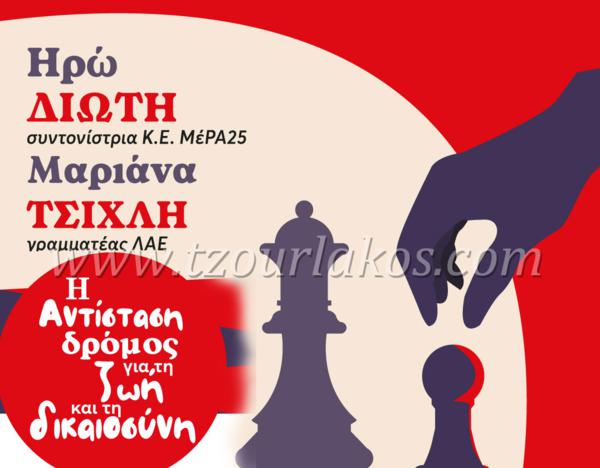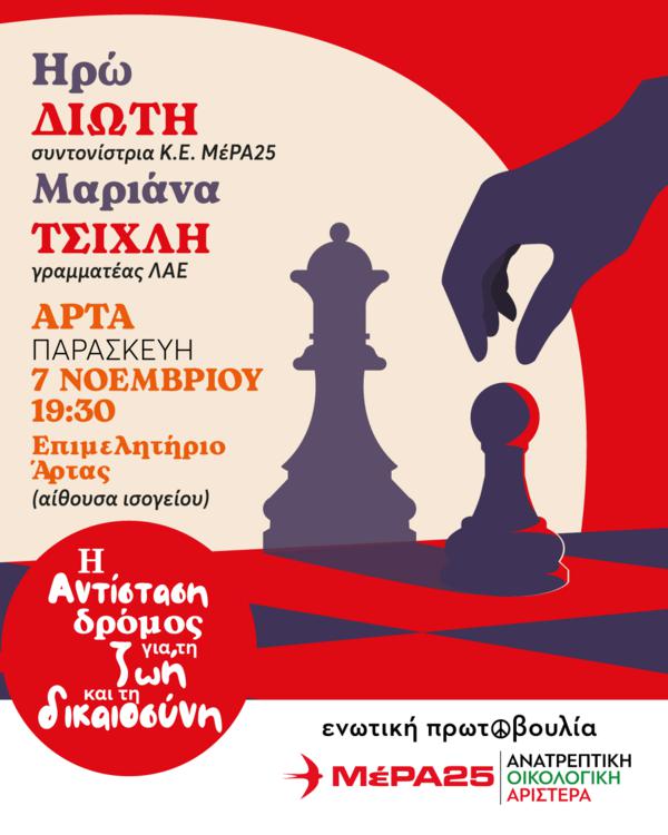Η Ενωτική πρωτοβουλία ΜέΡΑ25 Ανατρεπτική Οικολογική Αριστερά διοργανώνει πολιτική εκδήλωση την Παρασκευή 7 Νοεμβρίου 2025, στις 19:30, στο Επιμελητήριο Άρτας (Αίθουσα ισογείου), με θέμα: «Η Αντίσταση, δρόμος για τη ζωή και τη δικαιοσύνη».