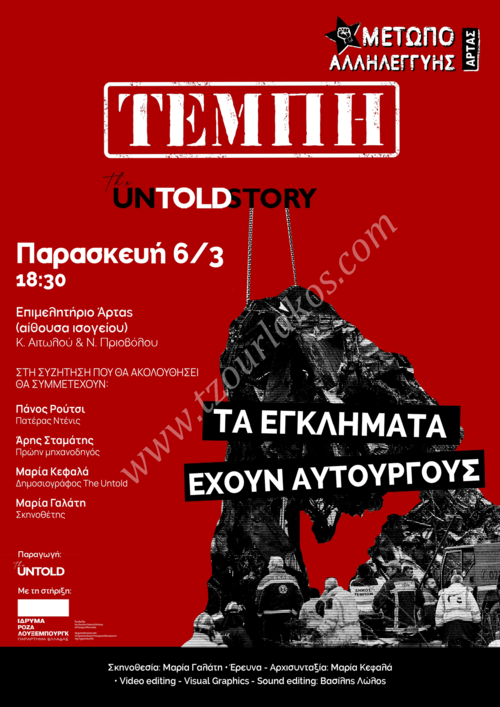 Την Παρασκευή 6 Μαρτίου 2026, στις 6:30 το απόγεμα στο Επιμελητήριο Άρτας, διοργανώνουμε εκδήλωση συζήτηση και προβολή του ντοκιμαντέρ ΤΕΜΠΗ: The UnTOLD Stories με ομιλητές τους: