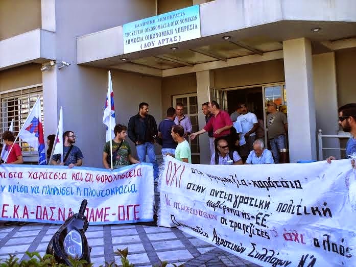 Σήμερα, Τετάρτη 10 Σεπτέμβρη πραγματοποιήθηκε παράσταση διαμαρτυρίας στην ΔΟΥ Άρτας, από το Εργατικό Κέντρο Άρτας και την Ομοσπονδία Αγροτικών Συλλόγων Νομού Άρτας, ενάντια στον ενιαίο φόρο ακινήτων (ΕΝΦΙΑ).