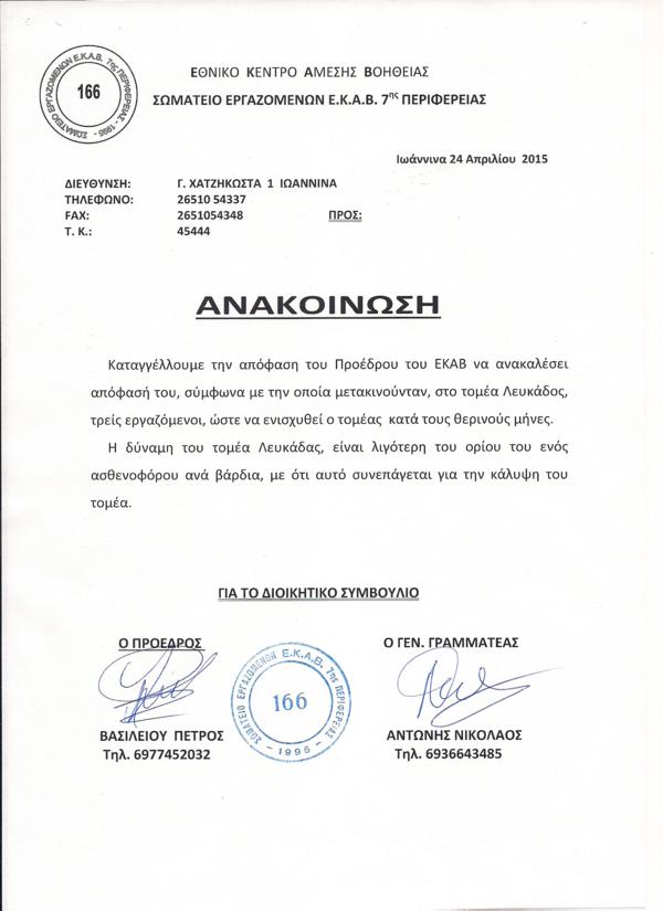 Ανακοίνωση Καταγγελία από το Σωματείο Εργαζομένων ΕΚΑΒ 7ης Περιφέρειας.