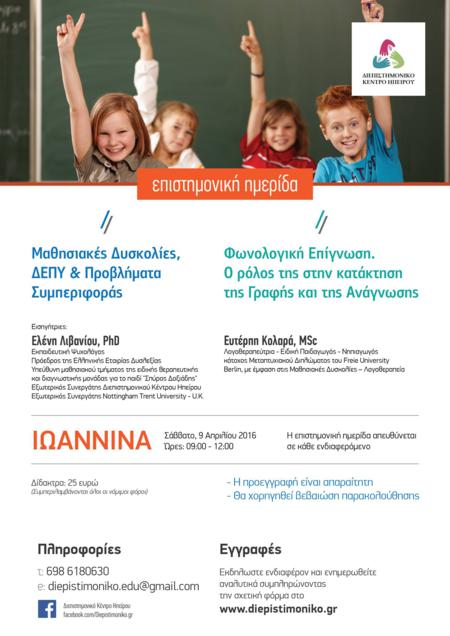 Το Διεπιστημονικό Κέντρο Ηπείρου διοργανώνει το Σάββατο 9 Απριλίου 2016 στα Ιωάννινα επιστημονική ημερίδα με θέμα τις Μαθησιακές Δυσκολίες και τη Φωνολογική Επίγνωση.