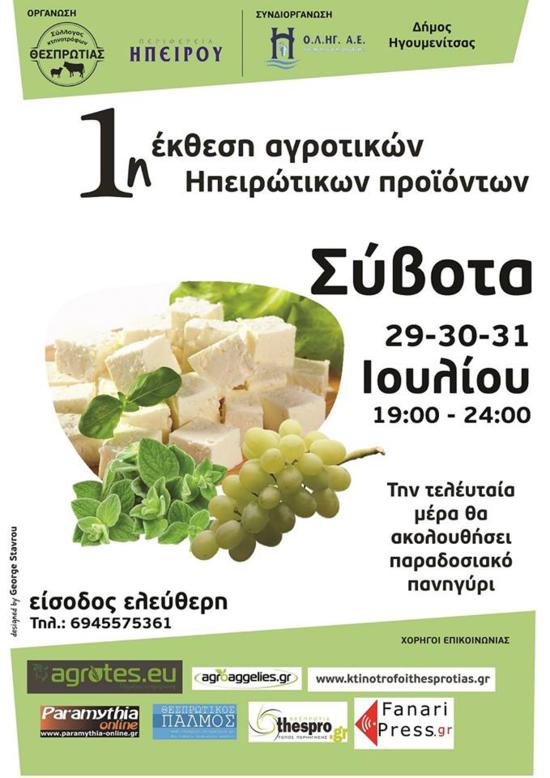 Σύβοτα Θεσπρωτίας, στο λιμάνι, το τριήμερο 29, 30 και 31 Ιουλίου 2016. Την έκθεση διοργανώνει Σύλλογος Κτηνοτρόφων Θεσπρωτίας μαζί με την Περιφέρεια Ηπείρου και θα έχει στο επίκεντρο της τοπικά προϊόντα της Ηπείρου (γαλακτοκομικά προϊόντα, αρωματικά φυτά, λαχανικά, φρούτα κ.α.). Για να εκθέσει κάποιος παραγωγός τα προϊόντα του είναι δωρεάν. Συνδιοργάνωνες της έκθεσης είναι ο Οργανισμός Λιμένα Ηγουμενίτσα και ο Δήμος Ηγουμενίτσας.
