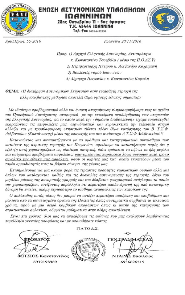 Ένωση Αστυνομικών Υπαλλήλων Ιωαννίνων.Επιστολή διαμαρτυρίας για το τμήμα Συνοριακής Φύλαξης της Καστάνιανης Πωγωνίου.
