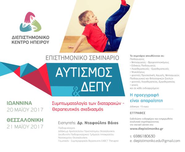 Μία ακόμα εξαιρετική πρωτοβουλία από το Διεπιστημονικό Κέντρο Ηπείρου, το οποίο πραγματοποιεί στα Ιωάννινα, το Σάββατο 20 Μαΐου, σεμινάριο για φοιτητές, επαγγελματίες και γονείς με θέμα τον Αυτισμό και τη ΔΕΠΥ.
