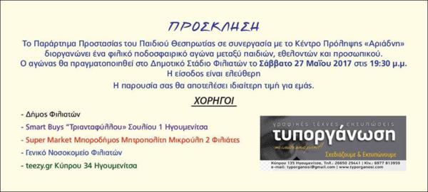 Στο Δημοτικό Στάδιο Φιλιατών πραγματοποιήθηκε χτες 27 Μαϊου φιλικός αγώνας ποδοσφαίρου που διοργάνωσε το Παράρτημα Προστασίας Παιδιού Θεσπρωτίας σε συνεργασία με το Κέντρο Πρόληψης «Αριάδνη» με τη συμμετοχή παιδιών, εθελοντών και προσωπικού.