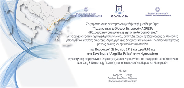 Ο Οργανισμός Λιμένος Ηγουμενίτσας διοργανώνει ημερίδα με θέμα: «Πολυτροπικός Διάδρομος Μεταφορών ADRIETA: Η θάλασσα των συνεργιών, η γη της πολυτροπικότητας», υπό την αιγίδα του Υπουργείου Ναυτιλίας και Νησιωτικής Πολιτικής και του Υπουργείου Υποδομών και Μεταφορών. Η ημερίδα θα πραγματοποιηθεί την Παρασκευή, 22 Ιουνίου 2018 και ώρα 09:00 π.μ. στην αίθουσα συνεδριάσεων του Ξενοδοχείου Angelika Pallas στην Ηγουμενίτσα.