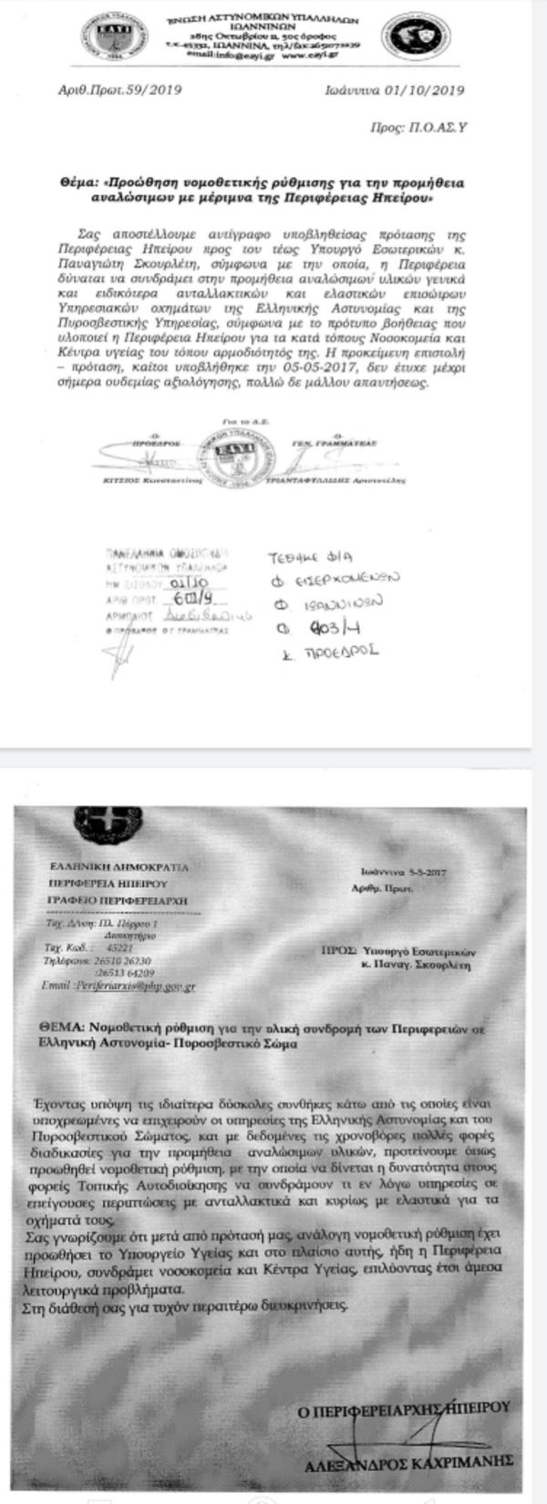 Στην συνάντηση του Διοικητικού Συμβουλίου της Ε.Α.Υ.Ι με τον Περιφερειάρχη Ηπείρου κ. Αλέξανδρο ΚΑΧΡΙΜΑΝΗ την 27 Σεπτεμβρίου 2019, μας γνωστοποιήθηκε πρόταση της Περιφέρειας Ηπείρου υποβληθείσα από τον Μάιο του 2017 προς τον τότε Υπουργό Εσωτερικών κ. Παναγιώτη Σκουρλέτη, σύμφωνα με την οποία δύναται η Περιφέρεια να συνδράμει στην προμήθεια αναλώσιμων υλικών γενικά και ειδικότερα ανταλλακτικών και ελαστικών επισώτρων, υπηρεσιακών οχημάτων της Ελληνικής Αστυνομίας και του Πυροσβεστικού Σώματος, σύμφωνα με το πρότυπο βοήθειας που υλοποιεί για τα κατά τόπους Νοσοκομεία και Κέντρα υγείας του τόπου αρμοδιότητάς της.
