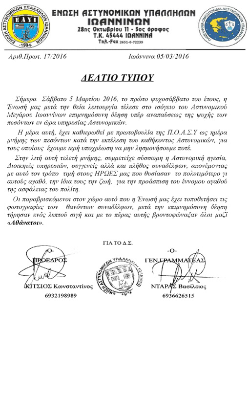 Ε.Α.Υ.Π.Επιμνημόσυνη δέηση υπέρ αναπαύσεως της ψυχής των πεσόντων Αστυνομικών