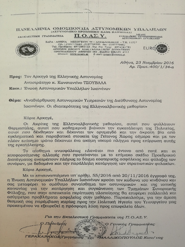 Π.Ο.Α.Σ.Υ:Επιστολή διαμαρτυρίας πρός τον Αρχηγό της Ελληνικής Αστυνομίας Αντιστράτηγο κ.Κωνσταντίνο Τσουβαλα