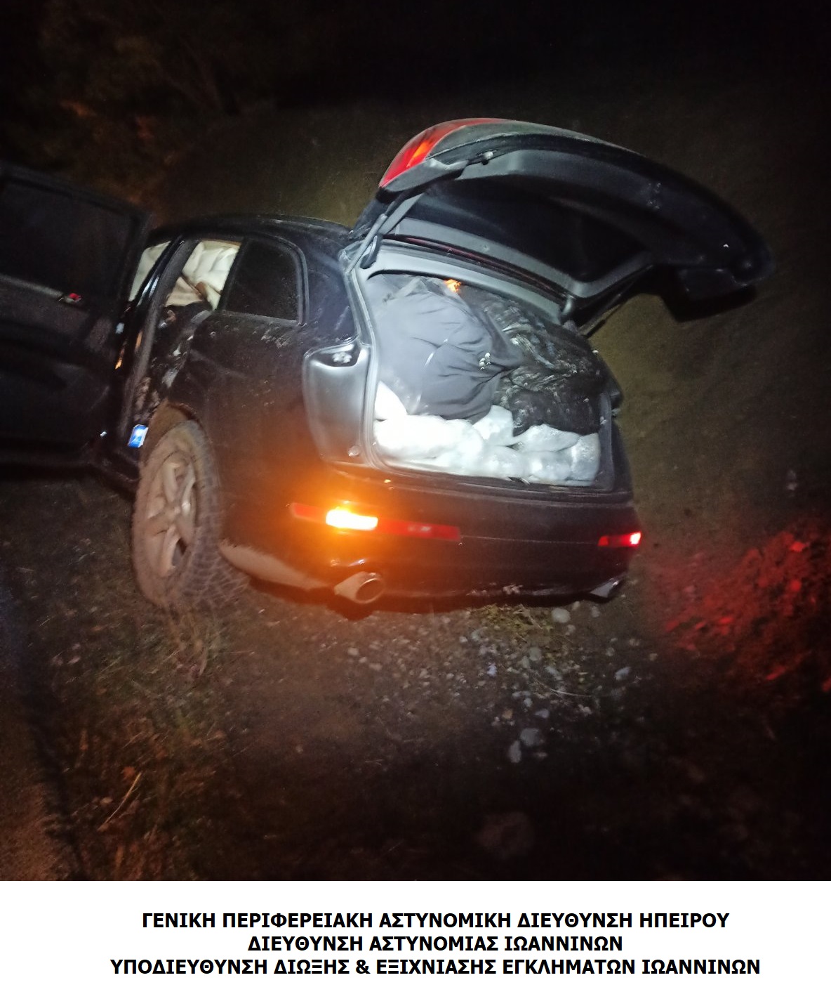 Το όχημα κατασχέθηκε, ενώ οι έρευνες του Τμήματος Δίωξης Ναρκωτικών, σε συνεργασία με το Τμήμα Εγκληματολογικών Ερευνών της Γενικής Περιφερειακής Αστυνομικής Διεύθυνσης Ηπείρου, για την ανακάλυψη της ταυτότητας του οδηγού, βρίσκονται σε εξέλιξη.