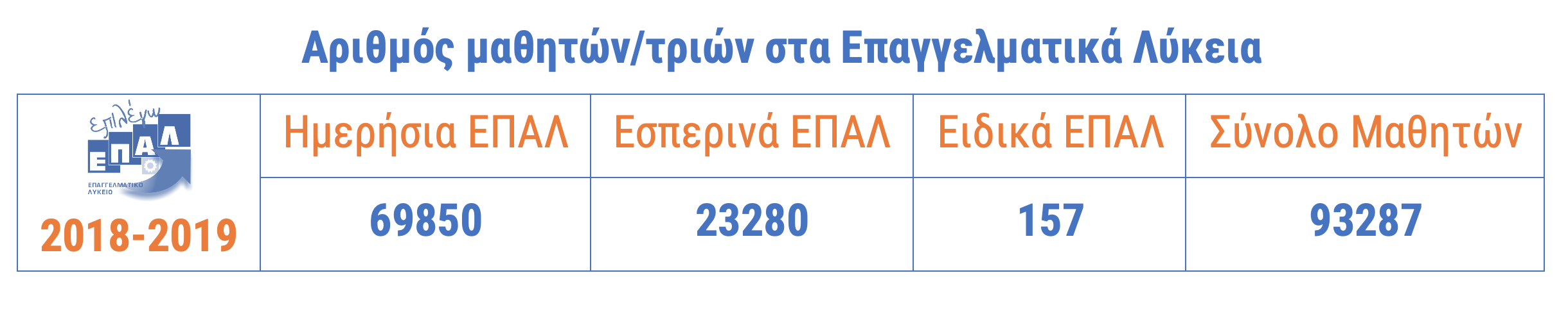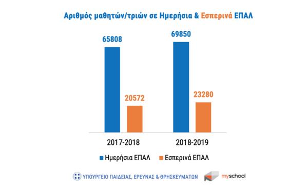 Σημειώνεται πως σε σχέση με το προηγούμενο σχολικό έτος (2017-2018), παρατηρείται αύξηση του μαθητικού δυναμικού στα ΕΠΑΛ κατά 7,7%, ενώ συνεχής αυξητική τάση καταγράφεται στην προσέλευση των μαθητών/τριών στα Εσπερινά ΕΠΑΛ (φετινή αύξηση σε σχέση με πέρσι: 13%).
