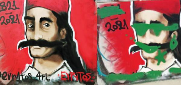 Ο νεαρός δημιουργός, που παρουσιάστηκε πρώτη φορά από τη δημοκρατία και προκάλεσε κύμα ενθουσιασμού, έχει ζωγραφίσει σε διάφορες γειτονιές της Αθήνας προσωπογραφίες των αγωνιστών του ’21. Μια από αυτές όμως, που εικονίζει τον Γεώργιο Καραϊσκάκη, βεβηλώθηκε με πράσινη μπογιά προκειμένου να «σβηστεί». Ποιον άραγε ενοχλεί μια τέτοια εικόνα; Μόνο τους γνωστούς εθνομηδενιστικούς κύκλους και την άκρα Αριστερά, που χρόνια τώρα προσπαθούν να συκοφαντήσουν οτιδήποτε εθνικό. Δυστυχώς βέβαια αυτή η ελεεινή προπαγάνδα βρίσκει έδαφος και σε ορισμένα μέσα ενημέρωσης.