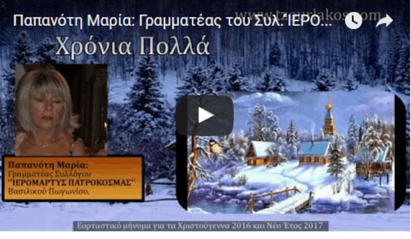 Παπανότη Μαρία: Γραμματέας του Συλλόγου ''ΙΕΡΟΜΑΡΤΥΣ ΠΑΤΡΟΚΟΣΜΑΣ''Βασιλικού Πωγωνίου.Εορταστικό μήνυμα για Χριστούγεννα και Νέο Έτος 2017.