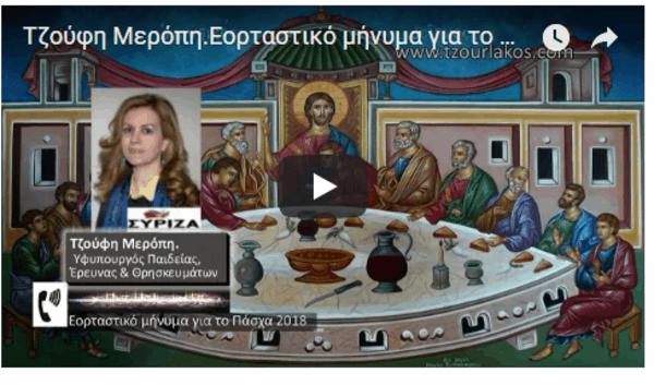 Τζούφη Μερόπη.Υφυπουργός Παιδείας Ενέργειας & Θρησκευμάτων Ηχογραφημάνο Εορταστικό μήνυμα για την Εορτή του Πάσχα 2018.