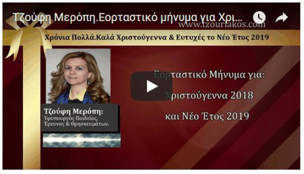 Τζούφη Μερόπη.Υφυπουργός Παιδείας Έρευνας & Θρησκευμάτων. Ηχογραφημένο Εορταστικό μήνυμα για Χριστούγεννα 2018 & Νέο Έτος 2019.